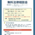 - [2025年度]秋季無料法律相談会のお知らせ平素より格別のご支援を賜り、誠にありがとうございます。このたび、法律相談部では地域貢献活動の一環として「秋季無… 続きを読む: [2025年度]秋季無料法律相談会のお知らせ